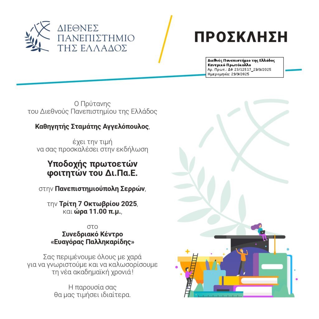 Ο Πρύτανης του Διεθνούς Πανεπιστημίου της Ελλάδος Καθηγητής Σταμάτης Αγγελόπουλος, έχει την τιμή να σας προσκαλέσει στην εκδήλωση Υποδοχής πρωτοετών φοιτητών του Δι.Πα.Ε. στην Πανεπιστημιούπολη Σερρών, την Τρίτη 7 Οκτωβρίου 2025, και ώρα 11.00 π.μ., στο Συνεδριακό Κέντρο «Ευαγόρας Παλληκαρίδης».