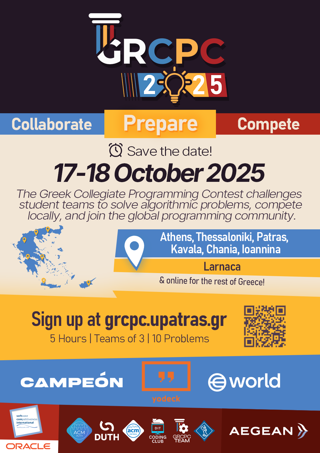 Ο GRCPC είναι ένας πανεπιστημιακός διαγωνισμός προγραμματισμού για ομάδες των τριών ατόμων, ο οποίος μπορεί να οδηγήσει σε πρόκριση στον αντίστοιχο διαγωνισμό Νοτιο-Ανατολικής Ευρώπης, που θα διεξαχθεί για πρώτη φορά στην Ελλάδα στο ΠαΜακ το Δεκέμβριο, και στη συνέχεια στο Πανευρωπαϊκό Πρωτάθλημα. Εκτός από την πρόκριση, οι νικητές θα έχουν την ευκαιρία να κερδίσουν διάφορα δώρα και να ζήσουν μία πρωτογενή εμπειρία στο competitive programming δοκιμάζοντας ταυτόχρονα τις ικανότητες!